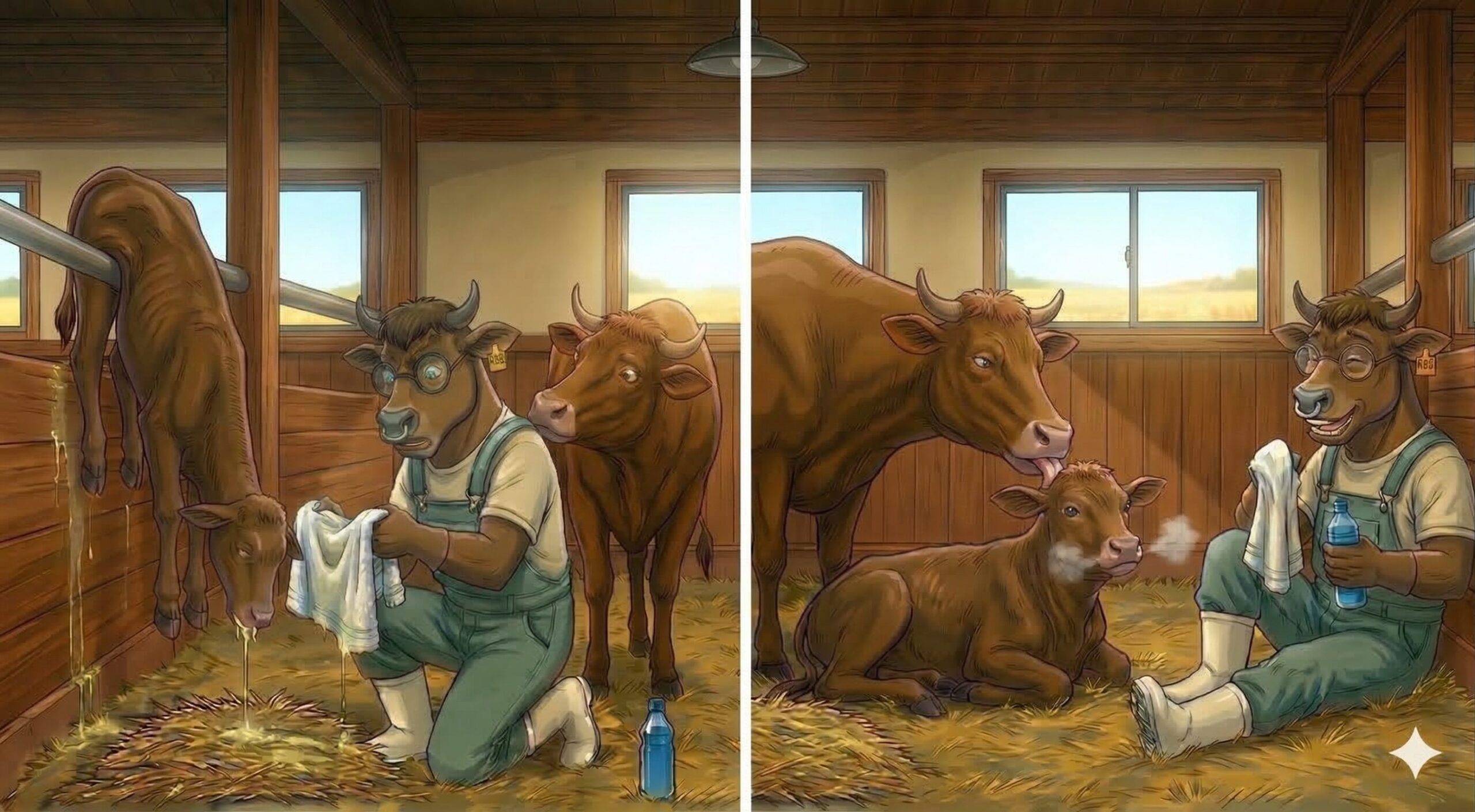 - 身体の強擦(きょうさつ): 藁の束で身体を激しく擦ります。これは単に羊水を拭き取るだけでなく、親牛がザラザラした舌で子を舐めるのと同じ刺激を与えるのが目的です。皮膚への刺激が血流を促し、子牛の意識を叩き起こします。😳