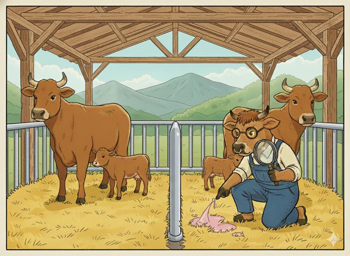 後産停滞は見た目ですぐに分かりますが、厄介なのは悪露停滞です。自社では目視だけでなく、**「嗅覚👃」**を研ぎ澄ませて観察しています。治療が必要なレベルの悪露停滞が起きている場合、牛舎に独特の強烈な臭いが発生するからです。